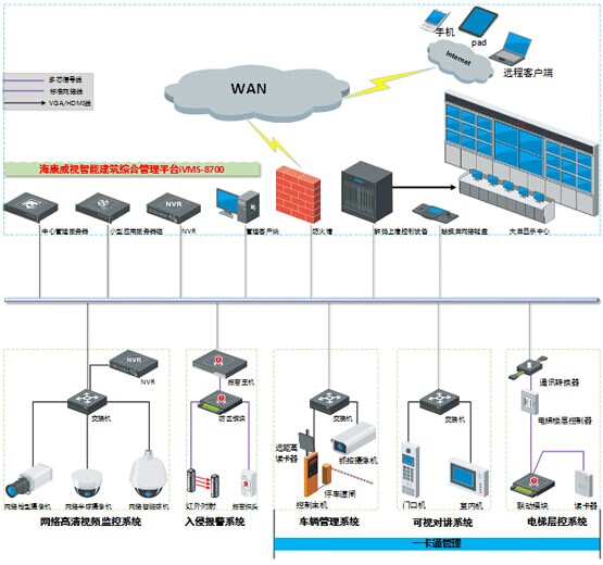 本方案以海康威视智能建筑综合管理平台为载体,前端可接入视频监控设备、入侵报警设备、车辆管理设备、可视对讲设备及电梯层控设备等众多子系统设备(根据小区项目规模与规划设计可扩展接入门禁、消费、考勤、访客等其它系统设备,实现一卡通应用),后端通过统一数据库进行数据存储。